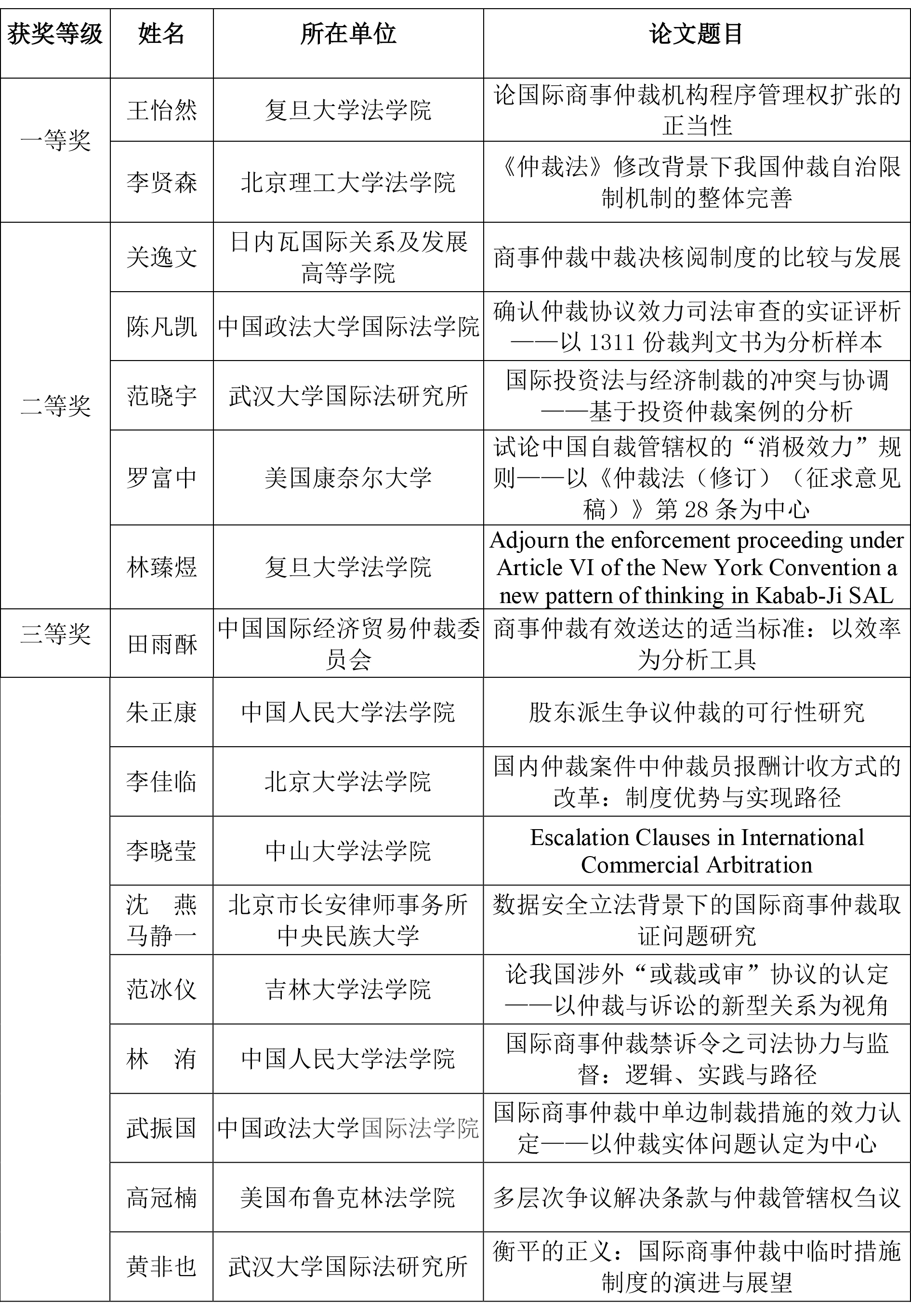 為感謝各界人士對本屆“中倫杯”國際商事仲裁征文大賽的支持,並鼓勵各界人士繼續關注中國國際商事仲裁事業的發展,特此評選出15項優秀獎。現將擬獲獎情況公示如下(以獲獎者姓氏筆畫為序):